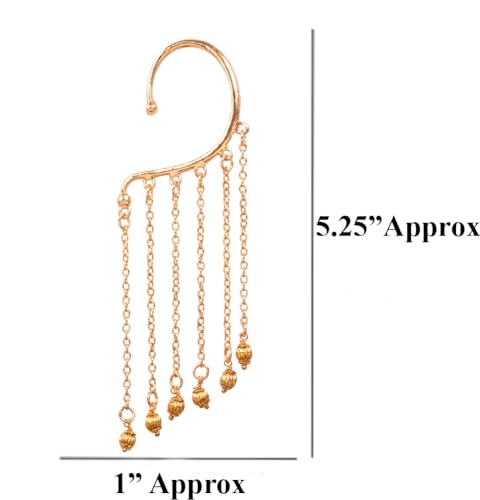 • NEW! Touchstone Indian Bollywood Fresh Fashion Innovative Outer Ear Shape Metallic Musk Melon Beads Hangings Adorable Designer Jewelry Earrings In Gold Tone For Women. EXTRA LONG EARRINGS: Length 5.25 Inches. SPECIFICATIONS: Earring Weight (Single) 9 Gms. Earring Length 4.50 Inches. (Till Hangings) Earring Width 1Inch.