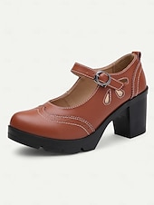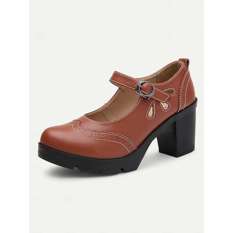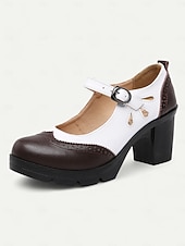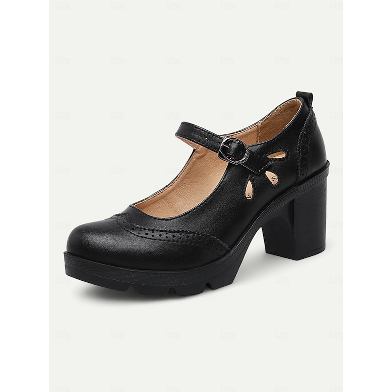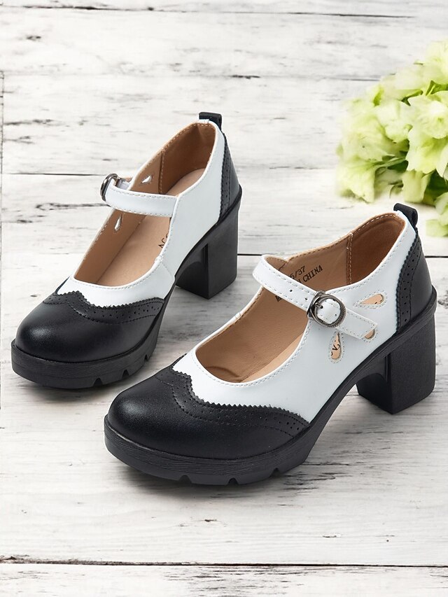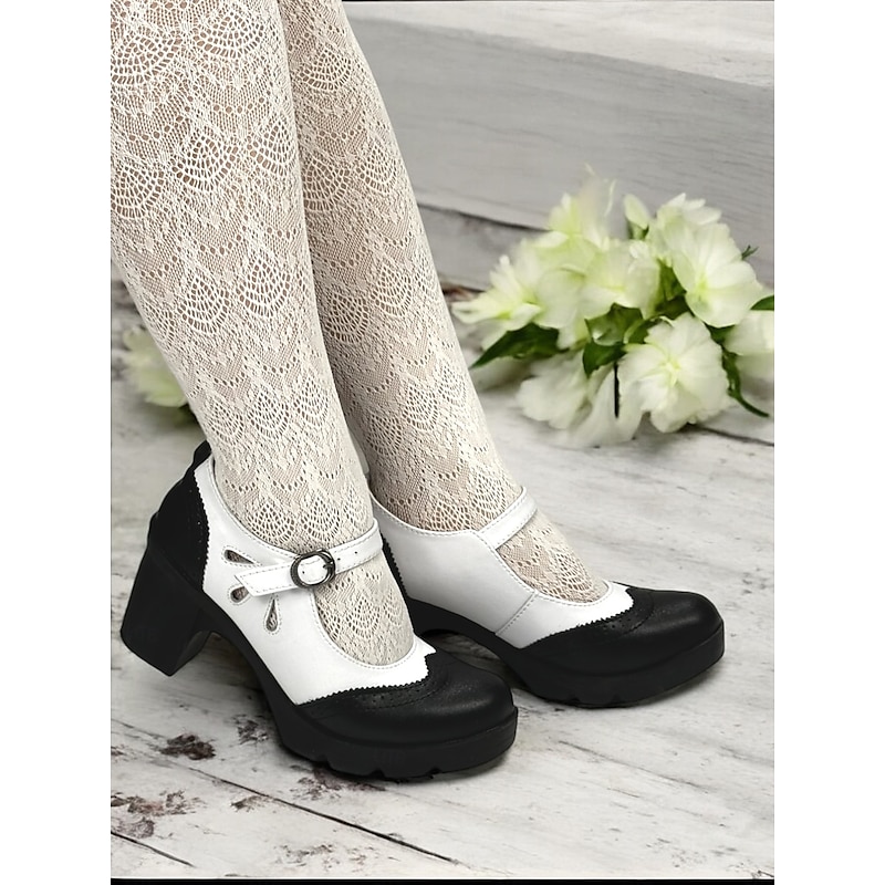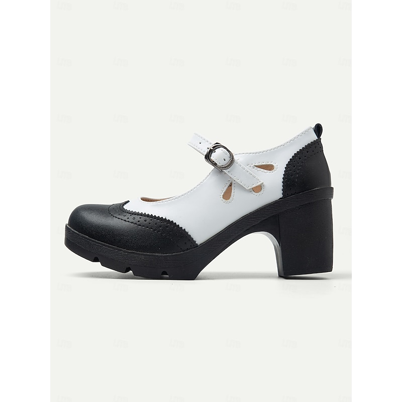Highlights [Fabric] : Crafted from high-quality PU and synthetic leather, these Mary Jane heels ensure durability and easy maintenance for daily wear. The material offers a comfortable fit alongside an elegant appearance, suitable for any occasion. [Style] : These shoes feature a vintage black and white brogue design with a chic color-block pattern. The classic round toe and sophisticated decorative perforations around the edges enhance their retro charm, making them a timeless addition to any wardrobe. [Design Highlights] : The chunky heels provide stability and comfort, offering a modern twist on the traditional Mary Jane style. The adjustable ankle strap with a sleek metal buckle ensures a secure fit, while the platform height of 0.79 inches adds a subtle lift without compromising comfort. [Occasions] : Ideal for both formal and semi-formal settings such as offices or weekend outings, these shoes effortlessly combine vintage flair with contemporary comfort. Whether for work or leisure, they are perfect for adding a touch of elegance to any ensemble. [Size Notice] : Available in a range of sizes from US5.5 / EU35 / UK3.5 to US10.5 / EU42 / UK8.5, these heels offer a standard fit, so it is recommended to select your usual size for the best fit.