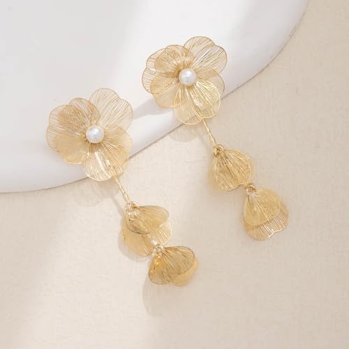 HOT ! 14K Gold Plated Statement Flower Earrings for Women Boho Statement Floral Prom Formal Earrings Lightweight Chunky Pearl Floral Petal Dangly Earring Christmas Stocking Stuffers Jewelry Gifts