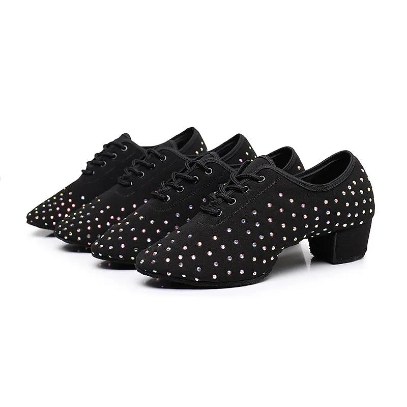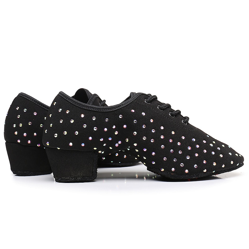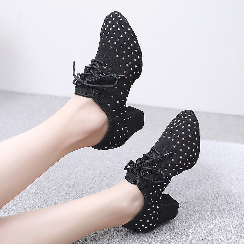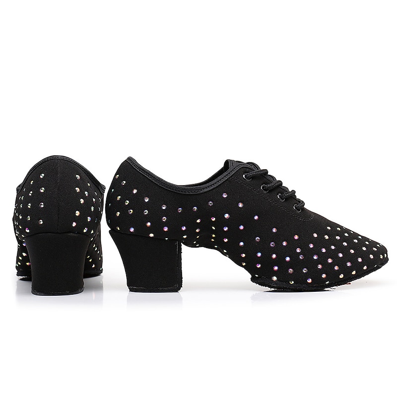 Women's Black Rhinestone Dance Shoes - Sparkling Suede Lace-Up Latin Ballroom Shoes with pleasant Heel and Non-Slip Sole