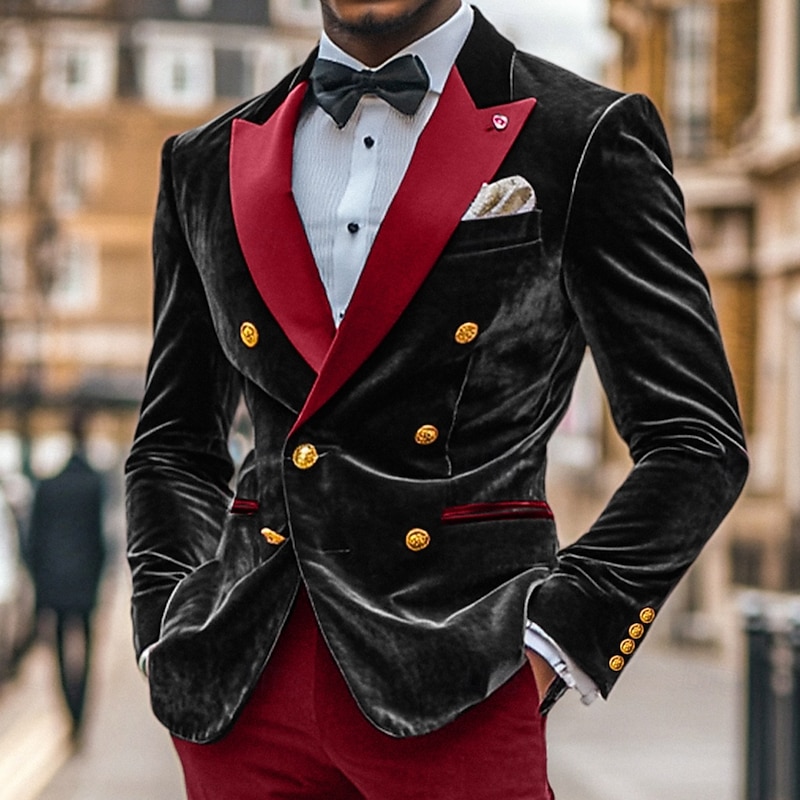 More information about Men's Blazer Jacket Tuxedo Closure collar Vintage Party Velvet Patchwork Solid Colored Blazer Black Burgundy Dark Blue Standard Fit Double Breasted Six-buttons