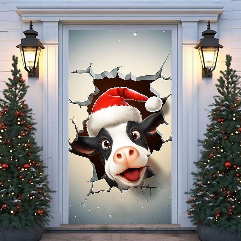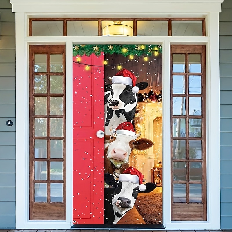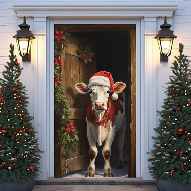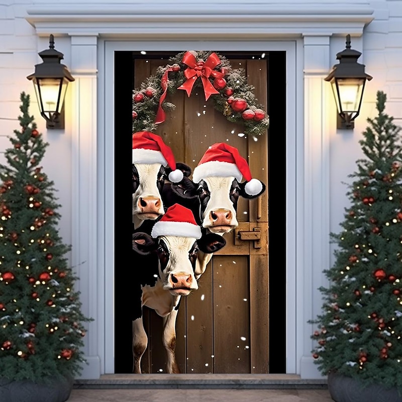HOT ! Christmas Door Decorations Cow Door Covers Door Tapestry Door Curtain Decoration Xmas Backdrop Door Banner for Front Door Holiday Party Decor Supplies