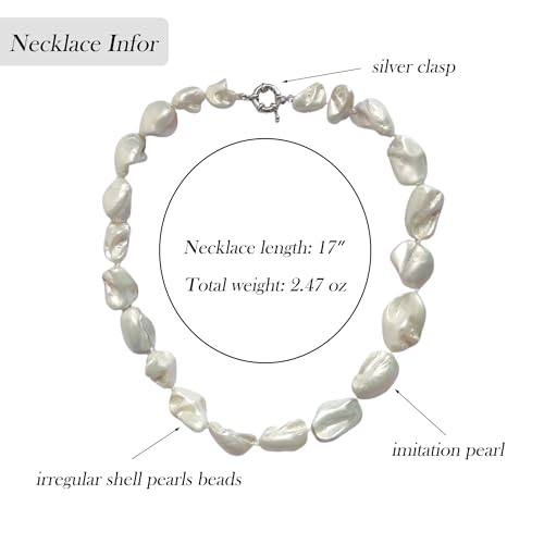 • Chunky Freshwater Pearl Shell Necklace: pearl statement necklace is about 17” long including the silver clasp represent noble and classic elegance, never outdated; match all your outlook