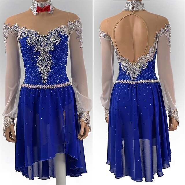 More information about Figure Skating Dress Women's Girls' Ice Skating Dress Royal Blue Thumbhole Open Back Mesh High Elasticity Training Competition Skating Wear Classic Crystal / Rhinestone Long Sleeve Ice Skating Figure
