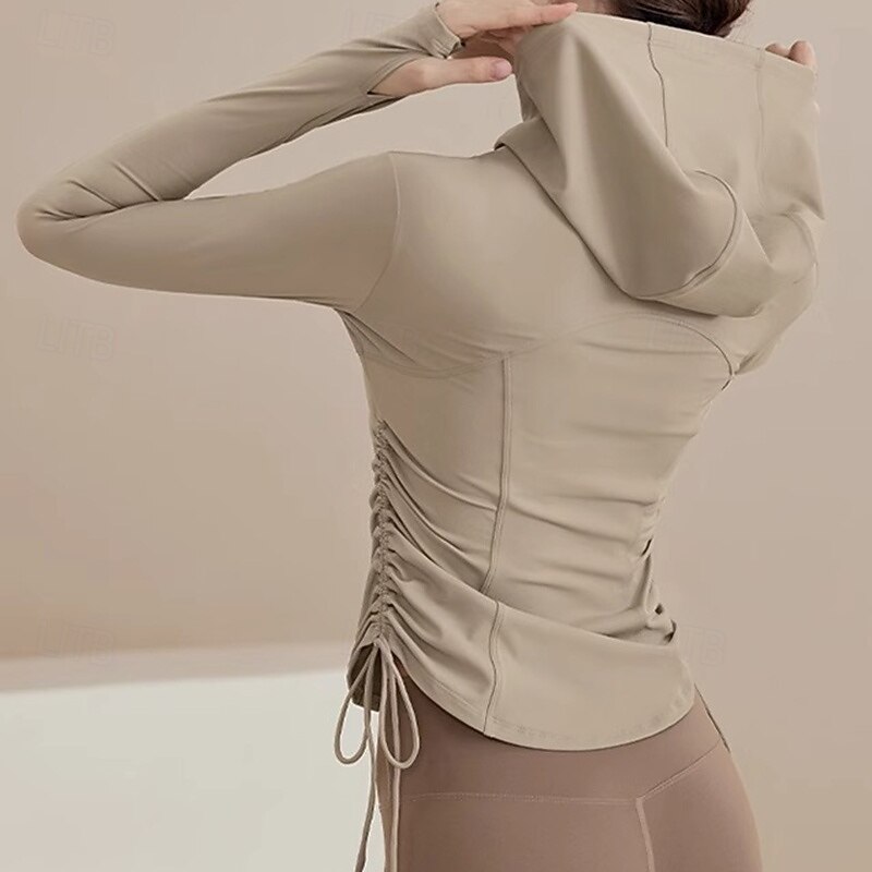 Women's Workout Jacket Stretchy Drawstring Long Sleeve Sports Solid Color Top For Gym Zumba Running Slim Activewear 14