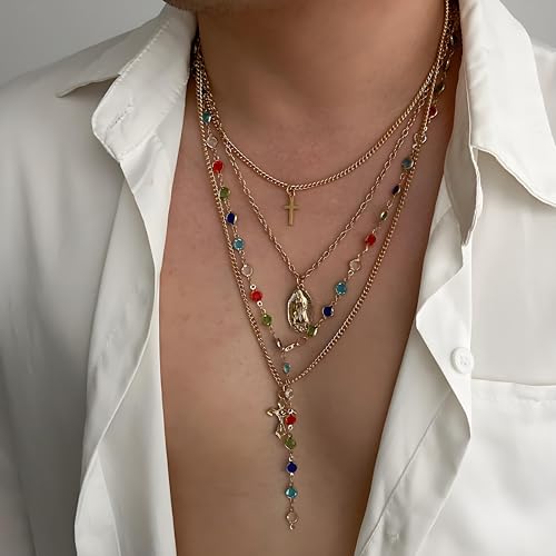 • 【Gold Layered Cross Necklaces For Women】:This 4-piece gold layered necklace set features a dainty cross pendant, vintage Virgin Mary medallion, colorful rhinestone chain, and classic gold link choker. Each piece can be worn alone or stacked for a bold, stylish statement—perfect for expressing your unique summer look
