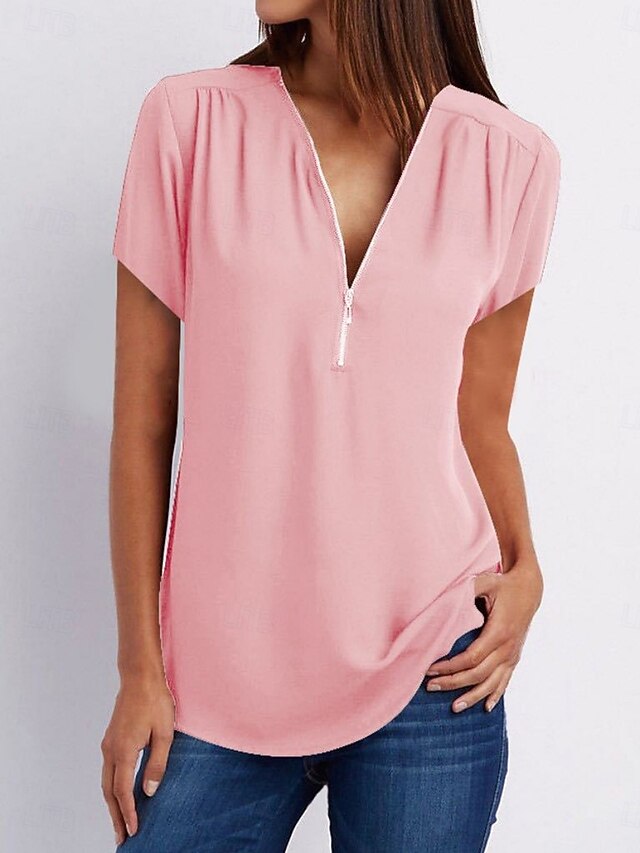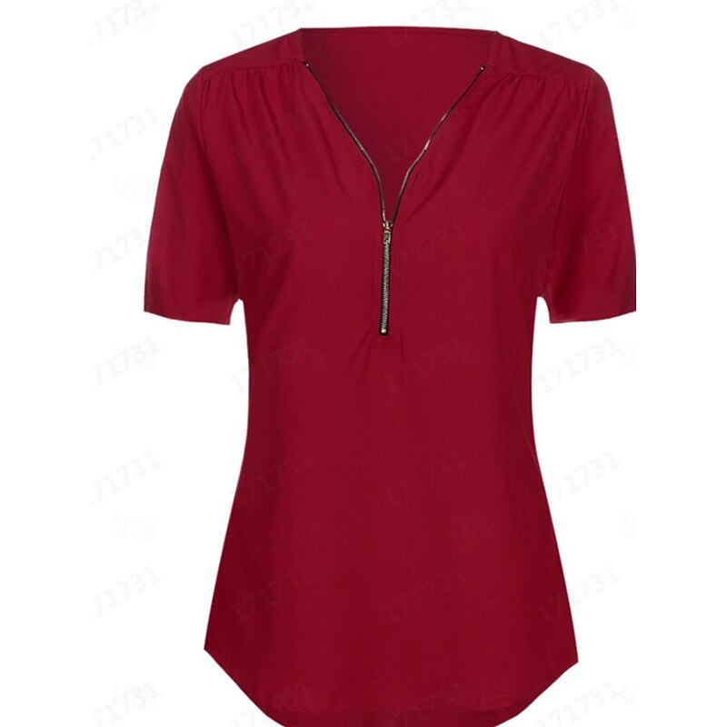 HOT ! Women's T Shirt Solid Color Plain Fashion Modern Casual Short Sleeve V Neck Regular Tops Daily Weekend Zipper Black White Pink Wine Royal Blue Summer