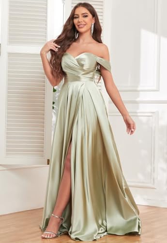 Long Satin Bridesmaid Dresses for Women Formal Off The Shoulder Prom Evening Gown with Slit 1