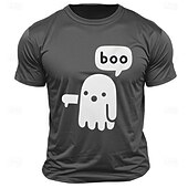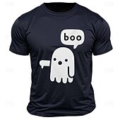 : Showcasing a playful letter print graphic that features a humorous "boo" in a speech bubble, this tee adds a touch of whimsy to your wardrobe. Its solid black, dark grey, or dark blue color options provide versatility for pairing with different outfits.