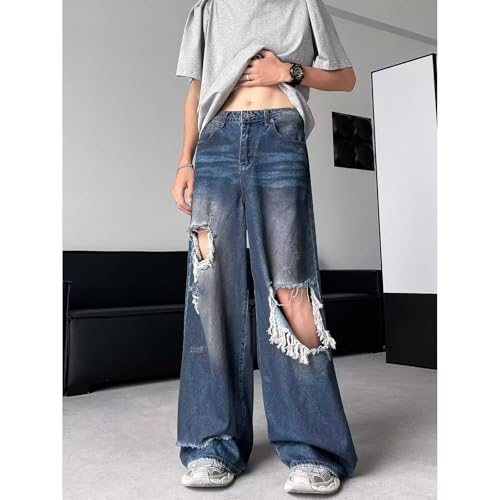More information about Men's Loose Fit Jeans Ripped Raw Edges Tassels Mid-Rise Wide-Leg Straight Casual Denim Pants with Pockets