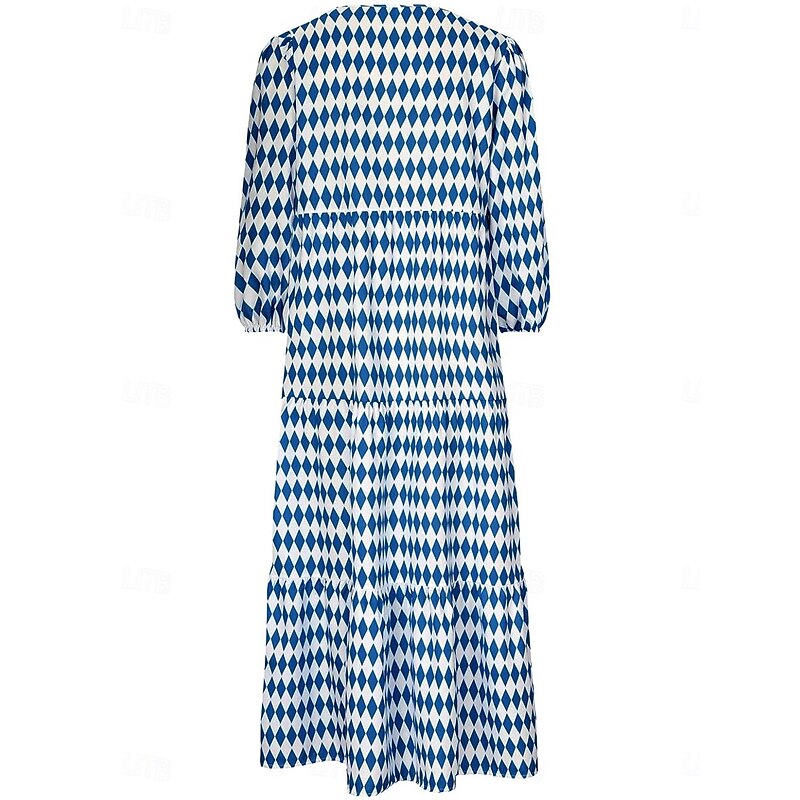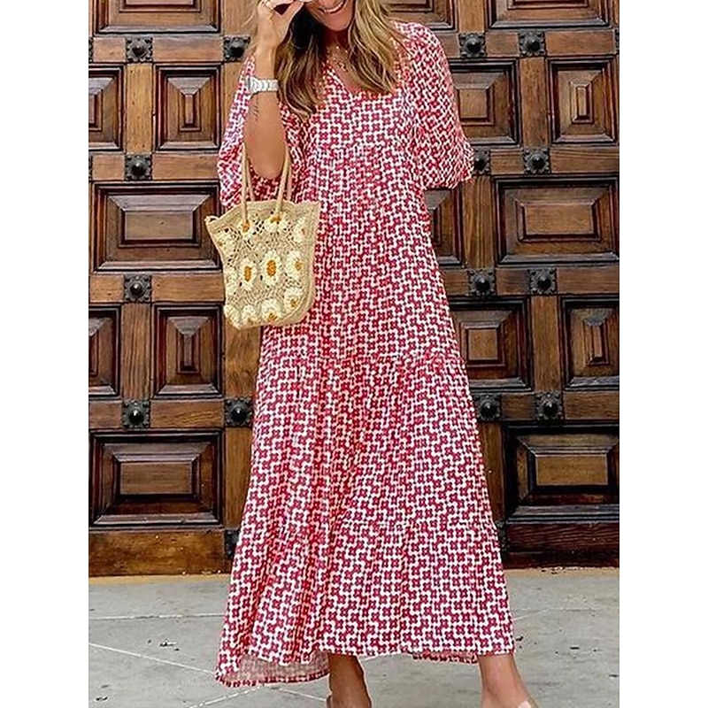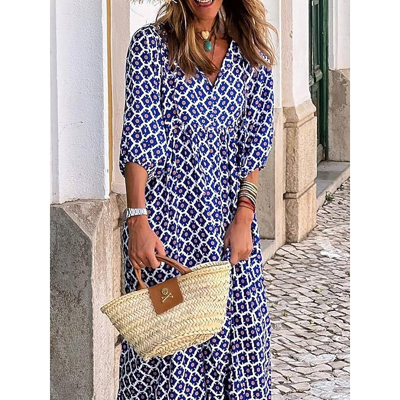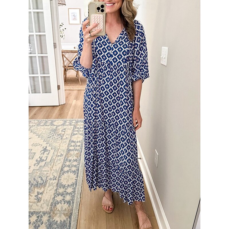 Women's Geometric Print V Neck Lantern Sleeve Maxi Dress Casual Daily Vacation 3/4 Length Sleeve Summer Spring