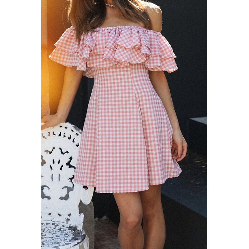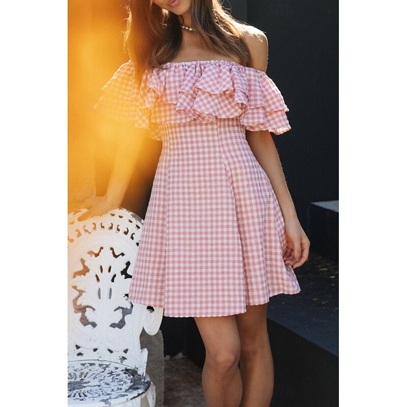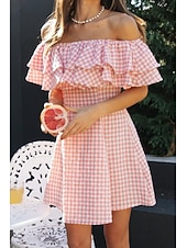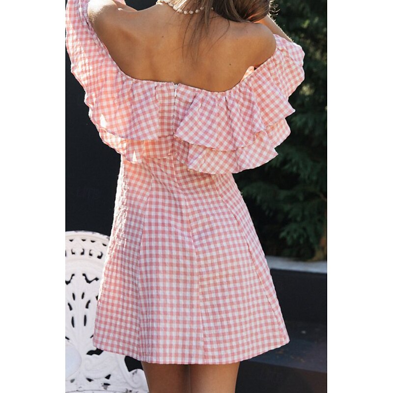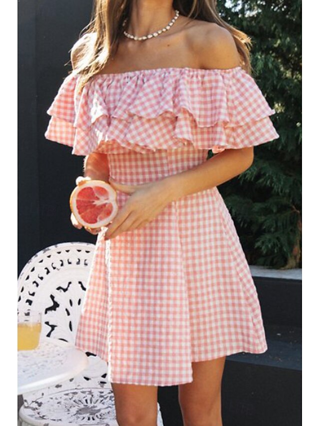 More information about Women's Mini Dress Graduation Dress Fashion Outdoor Daily Holiday Regular Fit Plaid Short Sleeve Off Shoulder Pink Summer