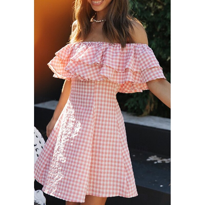 HOT ! Women's Mini Dress Graduation Dress Fashion Outdoor Daily Holiday Regular Fit Plaid Short Sleeve Off Shoulder Pink Summer