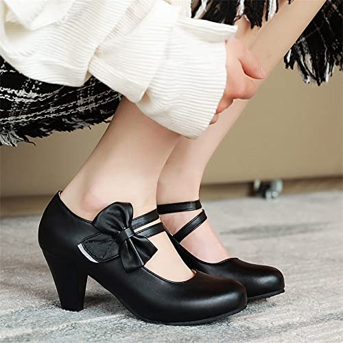 Elbslutt Women's Sweet Chunky Mary Janes Heels Bow Hook Loop Cute High Block Heel Ankle Strap Pumps Dress Shoes