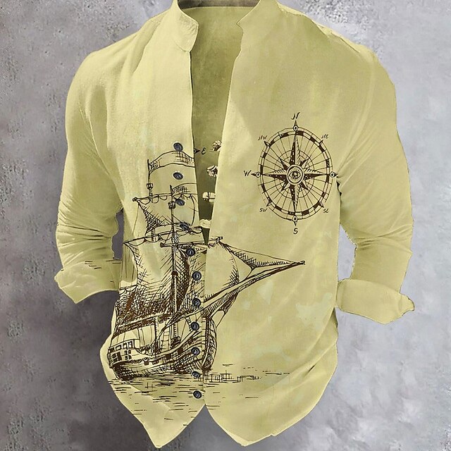 Men's Nautical Anchor Sailboat Shirt Button Up Shirt Long Sleeve Fashion Streetwear Designer Outdoor Casual Daily Summer Spring Fall Stand Collar Print White Khaki 7