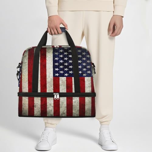 HOT ! Large Capacity Folding Travel Bag Lightweight Carry On Weekender Overnight Shoulder Bag Expandable American Flag Beauty Duffel Bags Dry and Wet Separation for Women Men Gym Sports