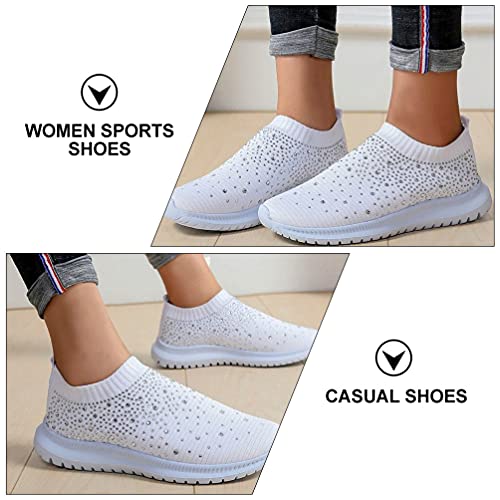 Womens Loafers Rhinestone On Sneakers Breathable Sock Shoes Mesh Walking Running Sports Shoes Platform Sneakers White 7