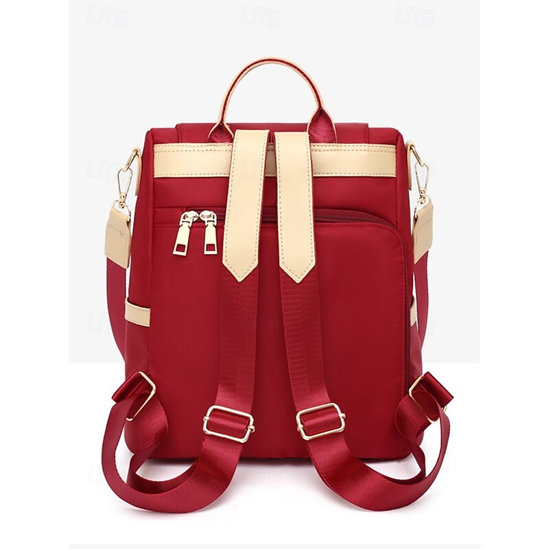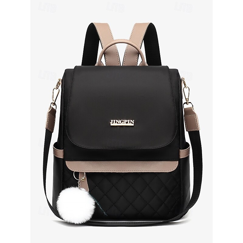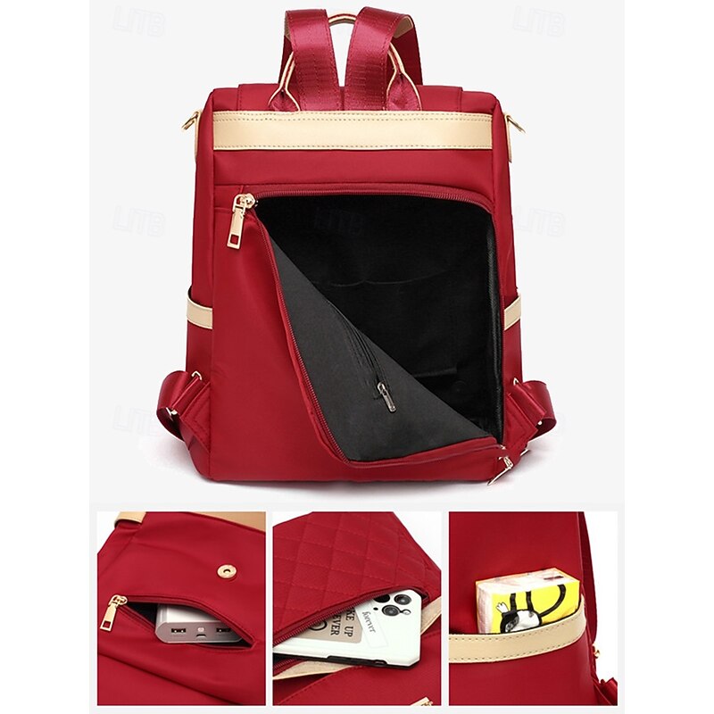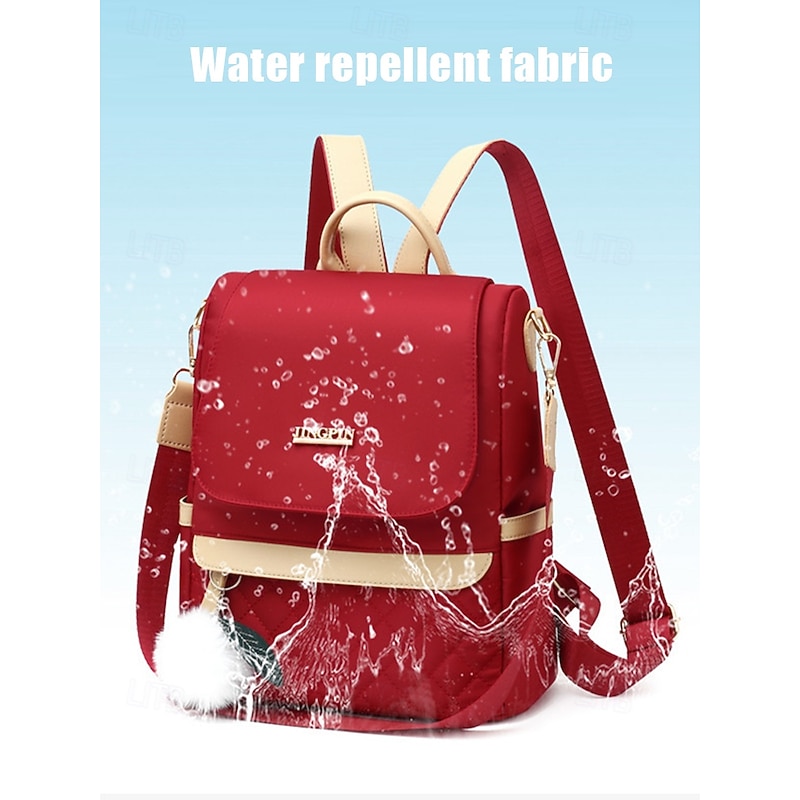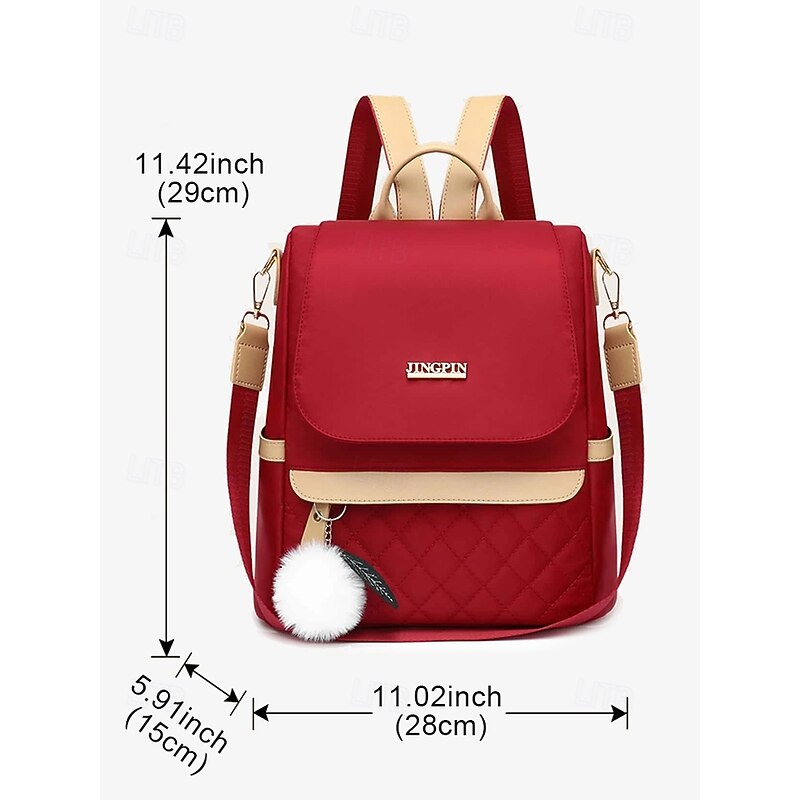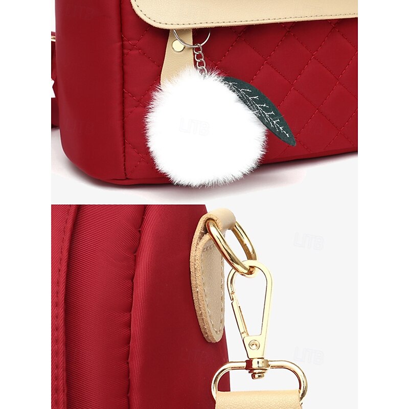 HOT ! Women's Quilted Red Backpack with Pom Pom Charm – Stylish and Practical Bag with Adjustable Straps and Beige Accents