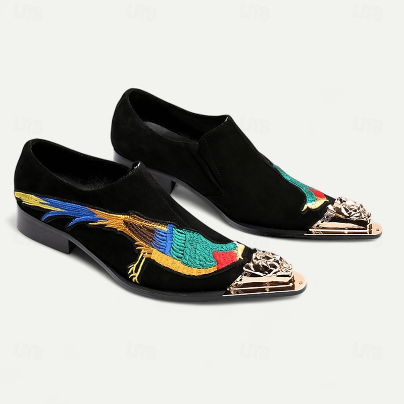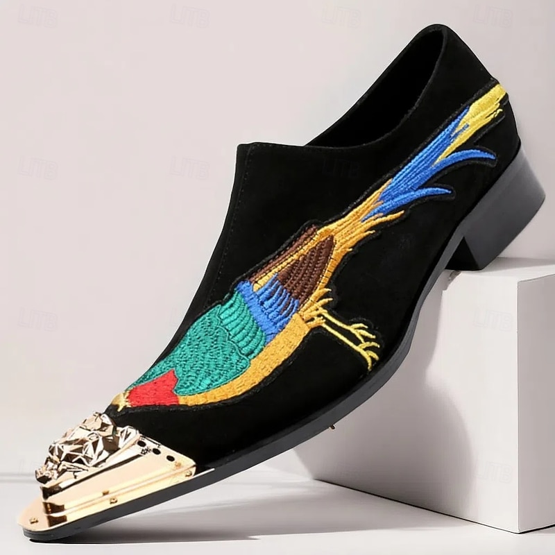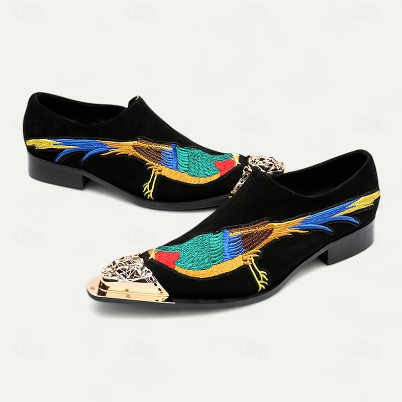 HOT ! Men's Embroidered Velvet Leather Loafers with Colorful Bird Design and Metal Toe – Luxury Slip-On Formal Shoes for Parties and Weddings