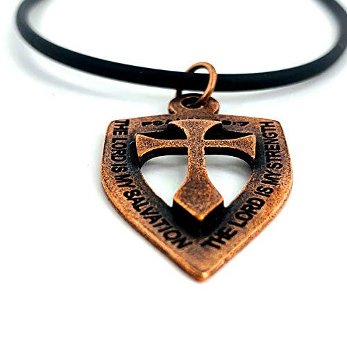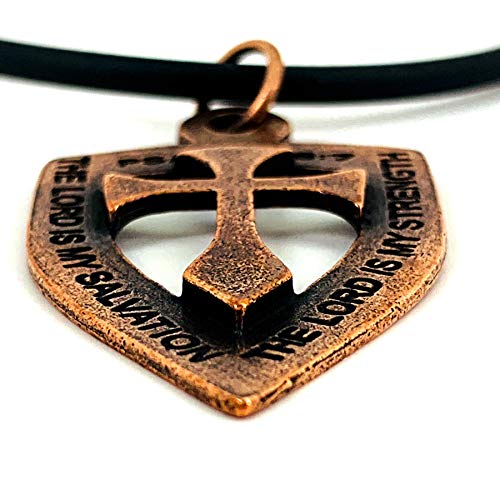 FORGIVEN JEWELRY Cross Shield Antique Copper Metal Finish Lord is My Strength and Salvation Necklace on Black Cord 1