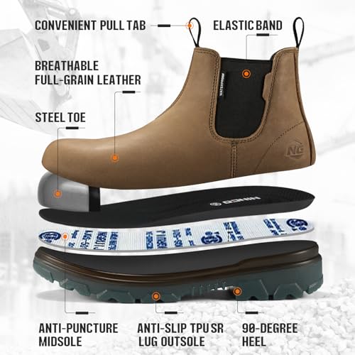 NINGO Waterproof Steel Toe Leather Chelsea Work Boots - Slip On, Puncture Resistant - Lightweight Safety Construction for Men & Women - Industrial, Warehouse