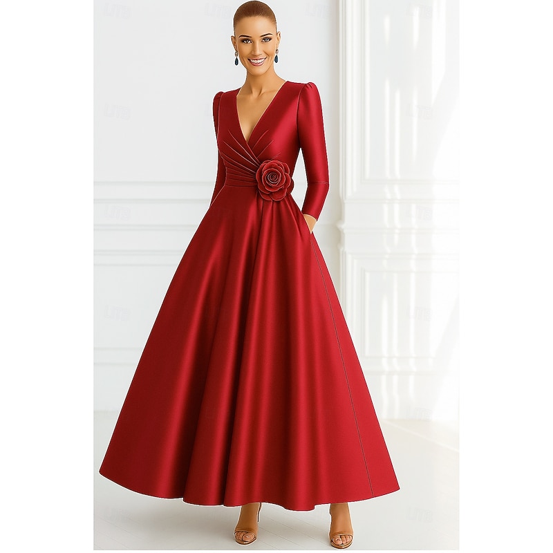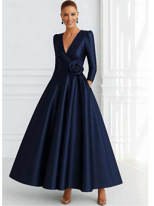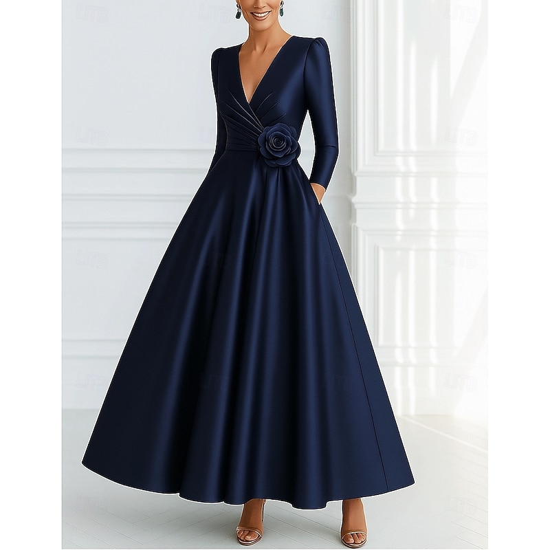 More information about Blue Black A-Line Evening Gown Elegant Dress Formal Wedding Floor Length 3/4 Length Sleeve V Neck Pocket Satin with Pocket 2025