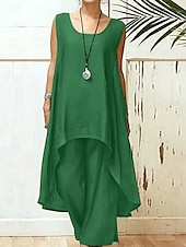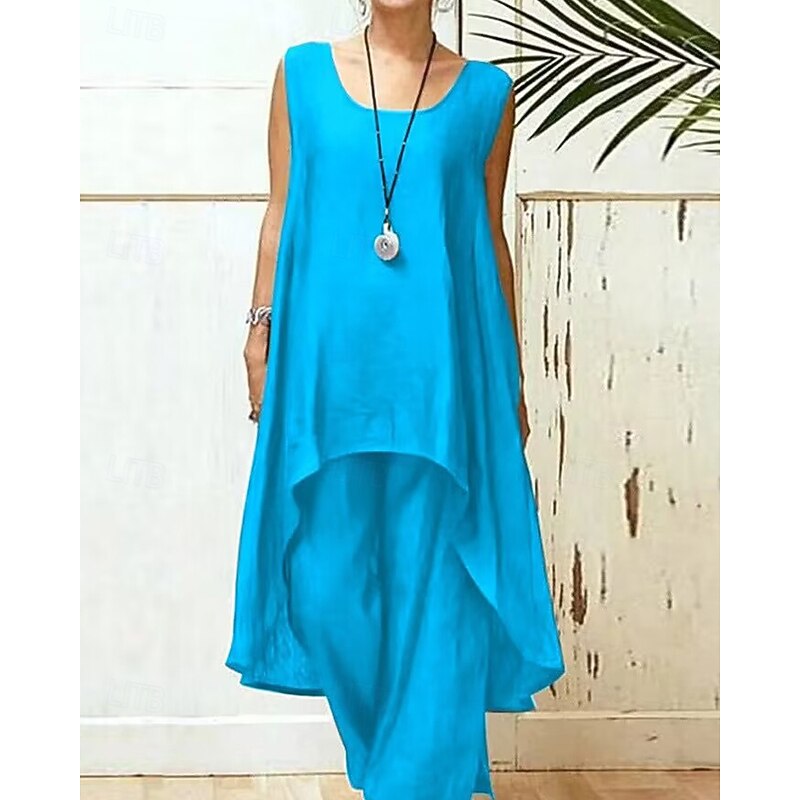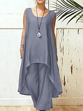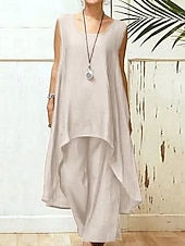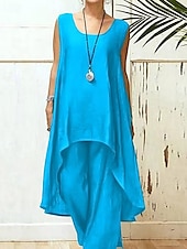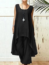 More information about Women's Active Cotton Linen Shirts Blouse Pants Sets Sleeveless U Neck Solid Color Vacation Holiday Black Dark Pink Blue Summer Regular Fit