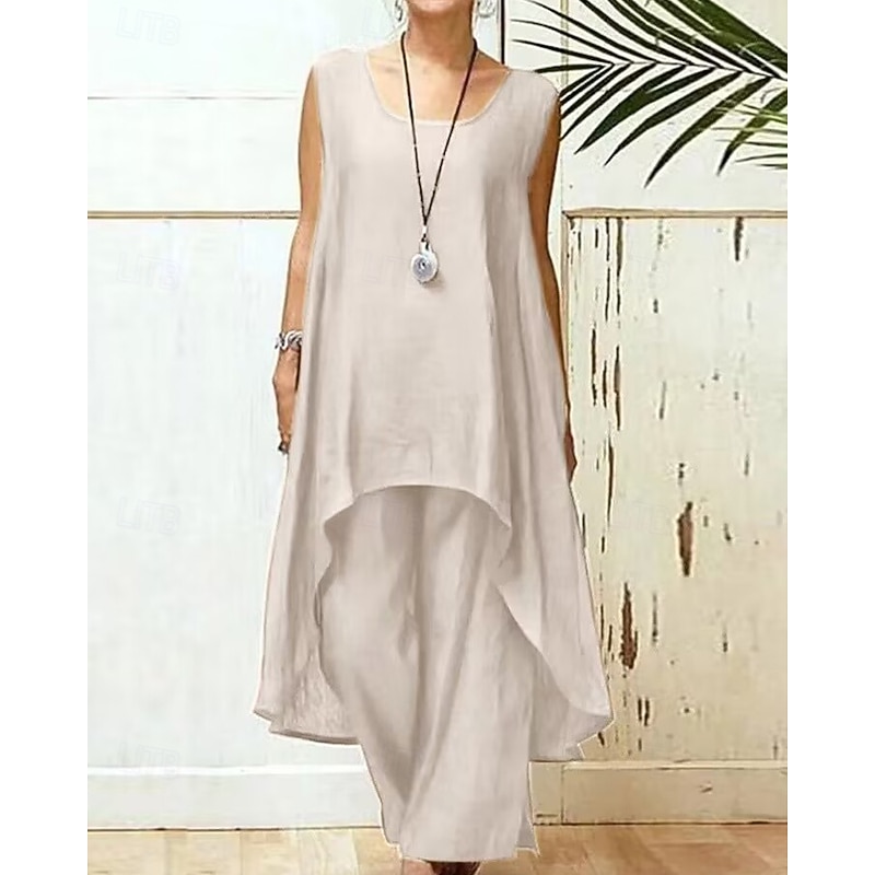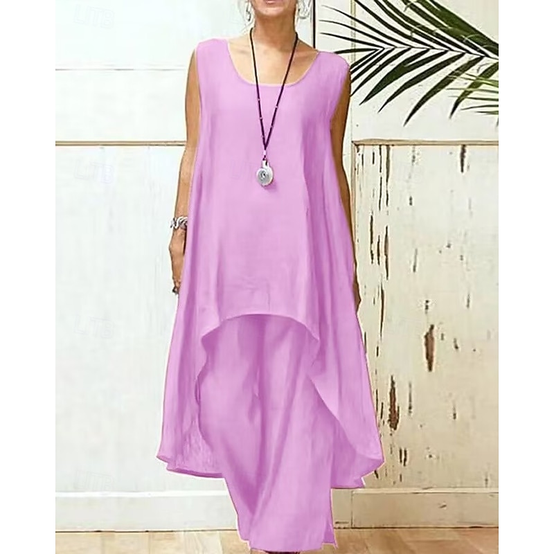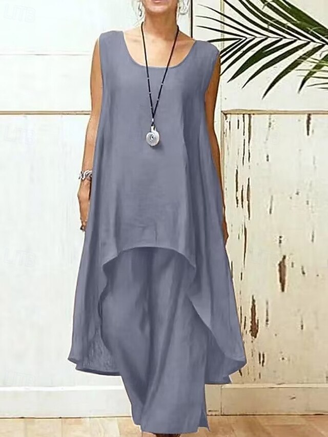 Women's Active Cotton Linen Shirts Blouse Pants Sets Sleeveless U Neck Solid Color Vacation Holiday Black Dark Pink Blue Summer Regular Fit 17
