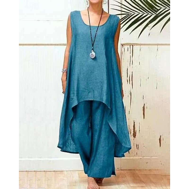 Women's Active Cotton Linen Shirts Blouse Pants Sets Sleeveless U Neck Solid Color Vacation Holiday Black Dark Pink Blue Summer Regular Fit 19