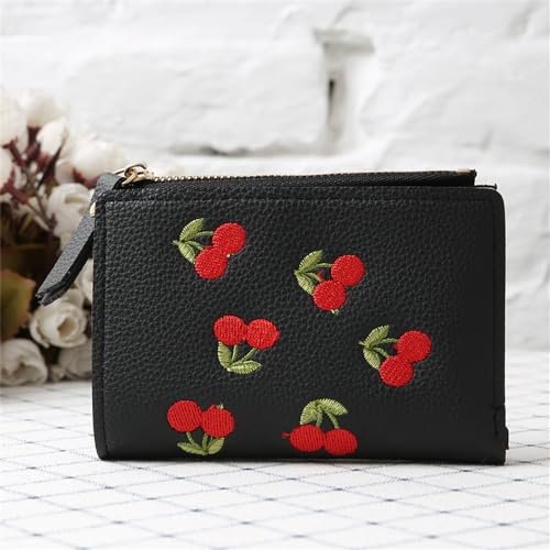 HOT ! Cute Cherry Embroidered Wallet Small Bifold Coin Purse Cherry Print Zipper Around Credit Card Holder RFID Blocking (Black)