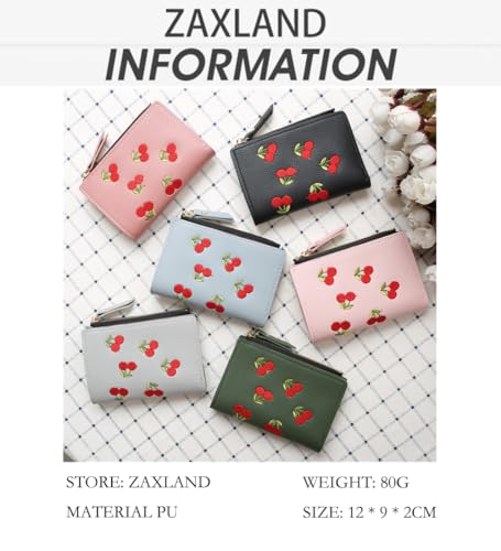 More information about Cute Cherry Embroidered Wallet Small Bifold Coin Purse Cherry Print Zipper Around Credit Card Holder RFID Blocking (Black)