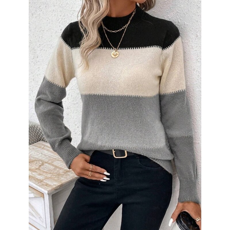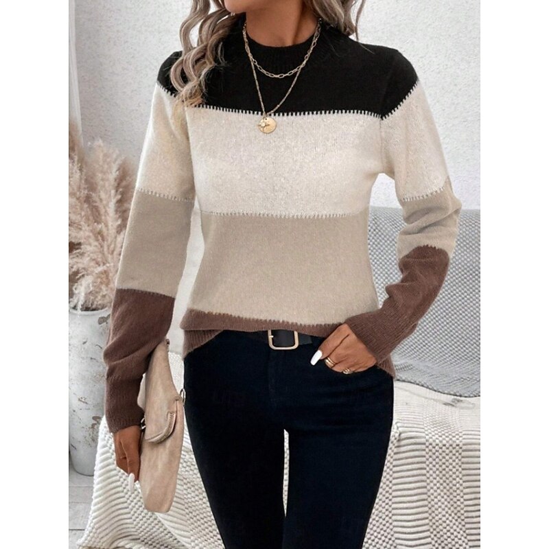HOT ! Women's Sweater Casual Soft Striped Ribbed Crew Neck Patchwork Knitted Long Sleeve Regular Tops Knit Outdoor Daily Weekend Pink Camel Fall Winter