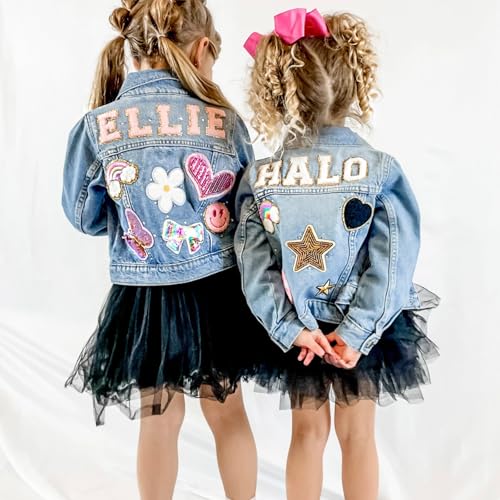 Personalized Kids Denim Jacket with Names, Cute Custom Chenille Letter Patch Children Denim Jacket for Girls Boys, Birthday Gift, Toddler Long Sleeve Jacket with Pattern Back to School Outfits