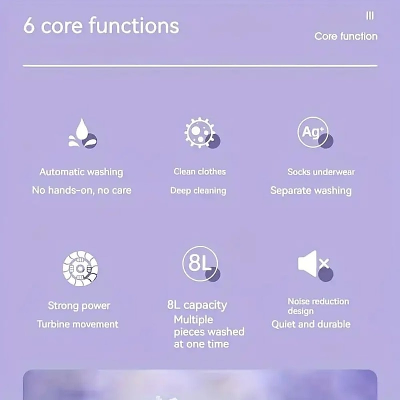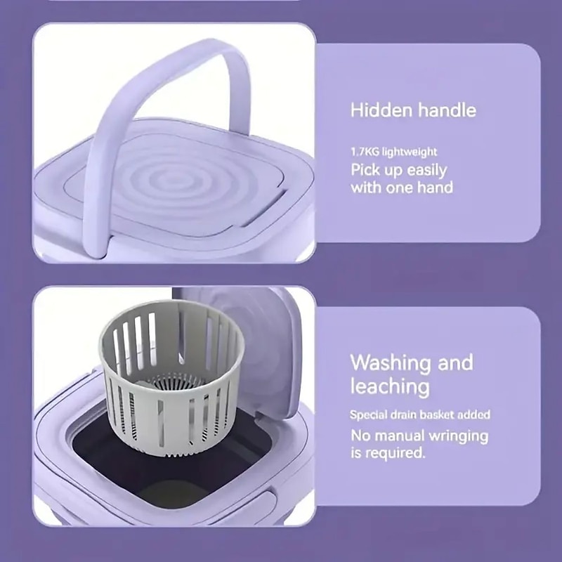 Highlights 1. Enjoy a multi-purpose machine that offers both washing and draining capabilities, leaving your clothes tender and moisture-free. 2. The intelligent three-gear mode allows you to customize the wash time according to the degree of clothing, providing ultimate convenience and flexibility. 3. Say goodbye to hand-washing with the 360° gentle washing feature that ensures your clothes are both clean and damage-free. The clothes are thoroughly cleaned with tough decontamination and gentle rotation, providing a cleaner alternative to traditional hand-washing methods. 4. Featuring a foldable design that saves space, this washing machine is ideal for small apartments, living rooms, balconies, and sundries rooms. With its compact and convenient design, it is easy to carry and store. 5. Enjoy powerful washing capabilities with a 10W strong washing power and 8L large capacity that enables you to wash personal clothes anytime without having to worry about accumulation. Specifications: - Made from environmentally friendly ABS and electronic components - IPX4 waterproof grade - 8L washing capacity - 12W rated power - Product size: 29.5x29.5x29cm - Folding height: 14.5cm