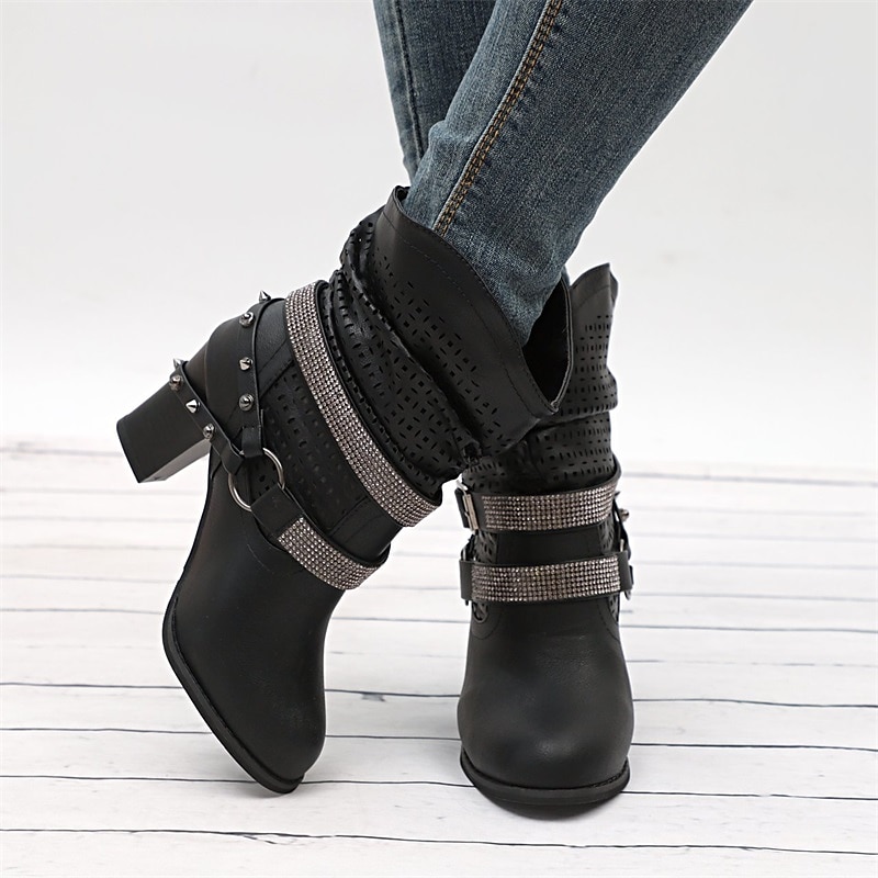Highlights [Fabric & Material] : These stylish women's ankle boots are crafted from high-quality PU, providing a luxurious and durable feel. The soft and slouchy design enhances comfort while walking. [Fit & Shape] : The ankle boots feature a slouchy shaft design, a classic round toe, and a mid chunky heel measuring 1-2 inches, offering both comfort and a flattering silhouette. The block heel provides enhanced stability for all-day wear. [Design Highlights] : The intricate cut-out patterns add elegance and breathability to the boots, while the studded straps and buckles offer a chic, edgy look. This fusion of details gives these boots a vintage, yet modern touch that stands out. [Occasions] : Perfect for daily wear or outdoor activities during the fall and winter seasons, these ankle boots effortlessly complement casual and boho-chic outfits. Their versatile grey color allows them to pair easily with a variety of wardrobe styles, adding a fashionable touch to any ensemble. [Size Range] : Available in a range of sizes from US5.5 / EU35 to US10.5 / EU42, these boots accommodate different foot sizes, ensuring a comfortable fit for everyone.