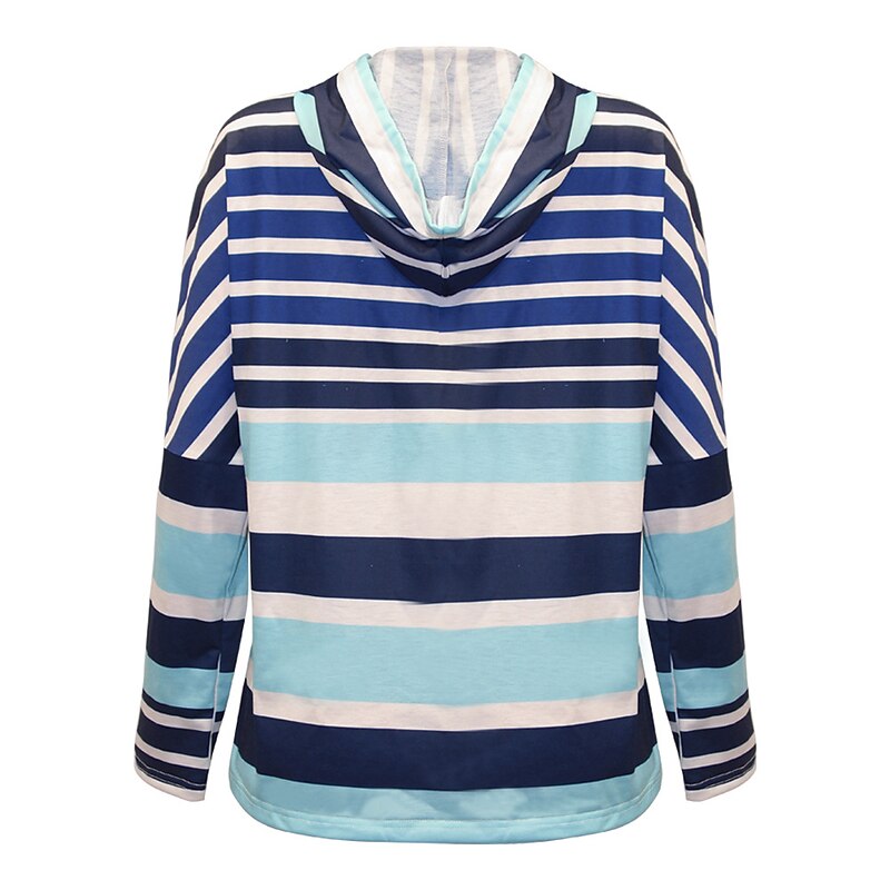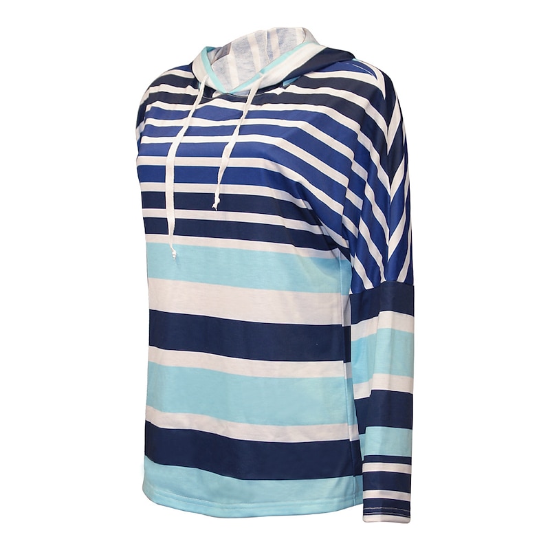 Highlights [Fabric] Crafted from high-quality polyester, this women's hoodie is designed to be soft and breathable, ensuring comfort during the cooler months of fall and winter. The micro-elastic material offers just the right amount of stretch for ease of movement in any activity. [Fit] With a regular fit, this hoodie provides a relaxed and comfortable silhouette. The long sleeves and regular length make it easy to layer over jeans or leggings, perfect for a casual yet modern look. [Design Highlights] The hoodie features a vibrant horizontal striped pattern in shades of navy blue, white, and light blue, adding a pop of color to your wardrobe. Complete with a drawstring-adjustable hood, it offers added comfort and a personalized fit, while the classic pullover design enhances its casual appeal. [Occasions] Ideal for casual settings and sports activities, this hoodie is your go-to choice for relaxed weekends, casual outings, or light sports. Its chic and modern style combined with a cozy feel makes it a versatile piece for various occasions. [Size Range] Available in size options ranging from S to 2XL, this hoodie caters to a wide range of fits and preferences, ensuring a suitable choice for many body types. Perfect for everyday use. top-grade materials and excellent craftsmanship ensure long-lasting durability.
