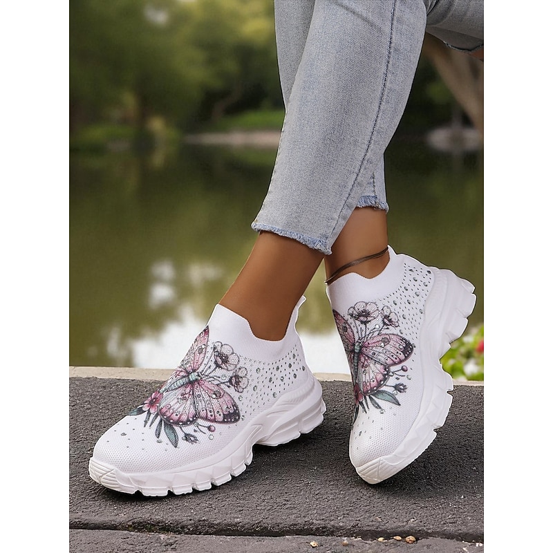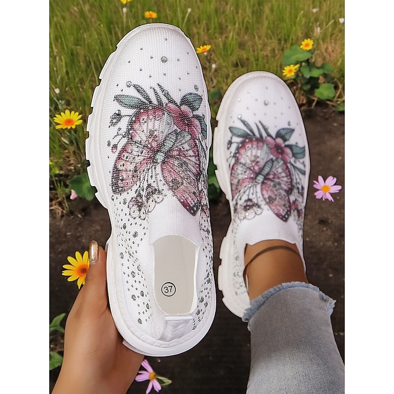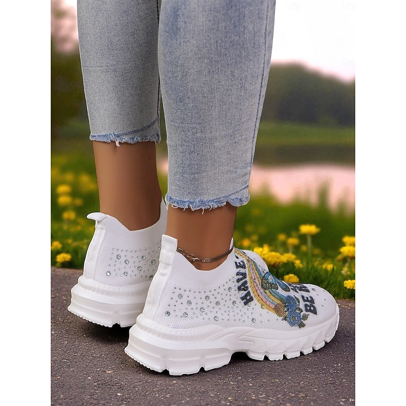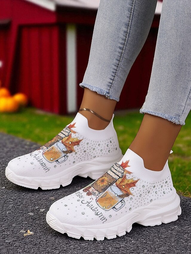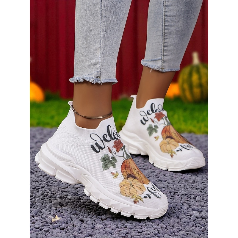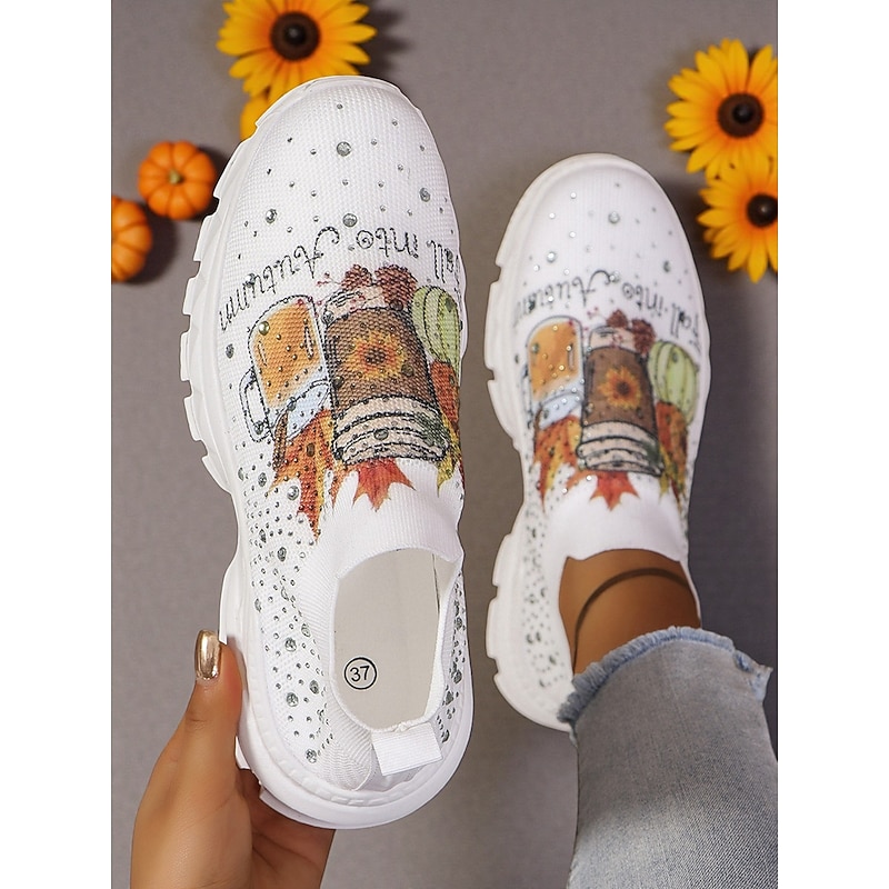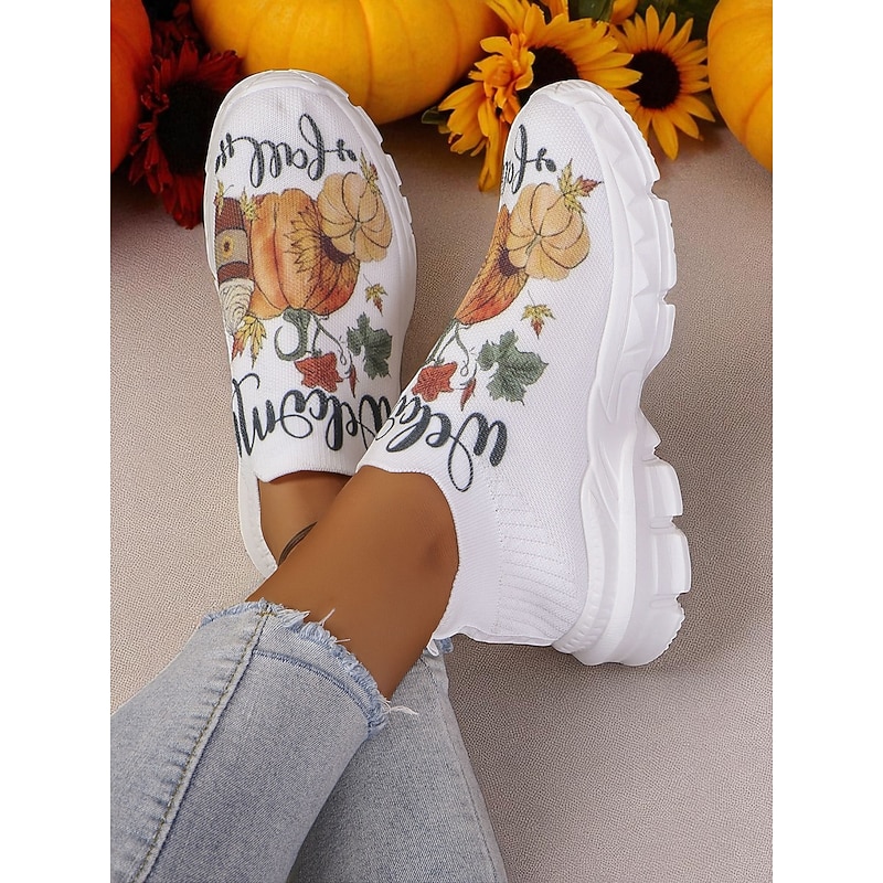 HOT ! Women's Flyknit Slip-On Sneakers with Autumn Pumpkin Coffee Print – Lightweight Casual Fall Walking Shoes for Halloween & Harvest Festival