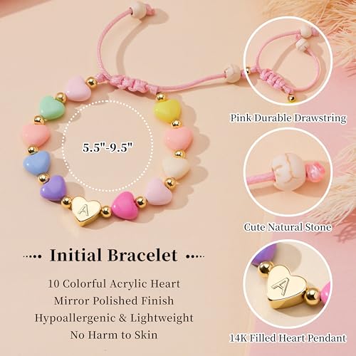 Metal type: BrassGem type: No gemstoneItem type name: Charm BraceletsJoin Prime Cancel anytimeDainty Beaded Initial Bracelet – Featuring 10 colorful heart beads and a charming letter pendant (A-Z), this bracelet is a perfect personalized accessory to showcase your style and personality. Trendy, playful, and eye-catching, it's suitable for daily wear or layering with other bracelets.Adjustable & cushy Fit – Inside circumference ranges from 5.5 to 9.5 with a strong drawstring, ensuring comfort without compromising style for women and girls. Lightweight and flexible, ideal for teens, moms, sisters, and friends.Premium Materials – Made of high-quality brass with 14K gold plating, hypoallergenic, lead-free, nickel-free, and resistant to fading. The colorful acrylic beads are durable and lightweight, designed for all-day wear while keeping your skin safe and comfortable.Perfect Personalized Gift – Each bracelet comes packaged in an exquisite gift box with a card. Customize the letter to reflect your name, family, or friends. Ideal for birthdays, Mother's Day, Valentine's Day, Christmas, or any special occasion.WomenGifts Promise - We're a young, vibrant brand dedicated to high-quality yet affordable jewelry. Your satisfaction matters—please reach out with any questions and we'll ensure you have a delightful experience. Perfect for everyday use. excellent materials and excellent craftsmanship ensure long-lasting durability.