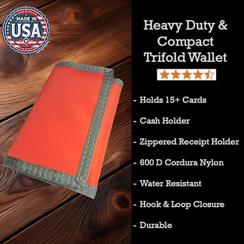Brand: Rainbow of CaliforniaColor: Bright Orange W/Foliage TrimMaterial: NylonStyle: Trifold WalletPattern: SolidDurable Construction – This tri fold wallet, expertly crafted from 600D Cordura, offers exceptional durability for military, outdoor, and travel use. Double-stitched seams ensure longevity, making it a reliable trifold wallet for men. Wallet has sturdy secure pockets for drivers license, med and credit cards, and most importantly has a second zippered cash compartment which is invaluable for storing traveling receipts and extra cash in a secure convenient way. Velcro closure ensures items are safely stored.Ample Storage – Designed with 15+ card slots, this wallet trifold provides organized storage. The zippered cash compartment and clear ID window enhance functionality, making it one of the most practical mens wallets trifold available. Measuring 5 High x 3 1/4 Wide, these trifold wallets are lightweight and compact for easy carrying while offering ample space, along with velcro closure.Water-Resistant – Engineered to resist water, dirt, and tough conditions, this wallet is easy to clean and built for adventure. Perfect for outdoor enthusiasts and rugged work environments, it delivers unmatched durability and reliability in any weather.Compact Design – Measuring 5 x 3.25, this tri fold mens wallet is compact yet spacious. Its lightweight nature makes it a perfect tri-fold wallet for those requiring a wallet for men 3 fold that is both portable and efficient.Secure Closure: Featuring a robust velcro closure, this trifold wallet for men ensures your essentials remain secure. The 3 fold wallets for men offer peace of mind during outdoor adventures and everyday use.Multi-function Structure – Streamline your life with a trifold wallet that organizes cards, cash, and coins in one compact design. Perfect for work, travel, or daily use, it offers quick access, lasting durability, and unmatched versatility, delivering incredible value every day. Perfect for everyday use. High quality materials and excellent craftsmanship ensure long-lasting durability.