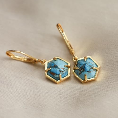 • Elegant Design: These Copper Turquoise earrings feature a unique hexagon shape gemstone, suspended gracefully from a secure lever back closure. The gold plating adds a luxurious touch, making them perfect for any occasion.