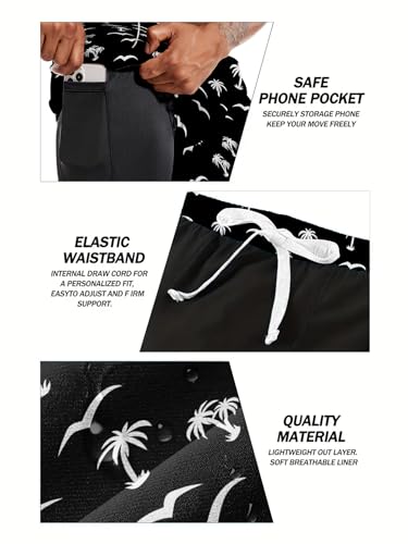 • Features: Drawstring closure, 2 in 1 Compression Liner, elastic waistband. The elastic waistband provides a snug and secure fit, preventing the shorts from slipping off while swimming or playing. Men's Bathing Suit with stylish printed and color. Solid color like black, blue, navy, gray and Army Green; also many tropical palm tree patterns, American flag pattern, They will show your personality and make you stand out at the beach.