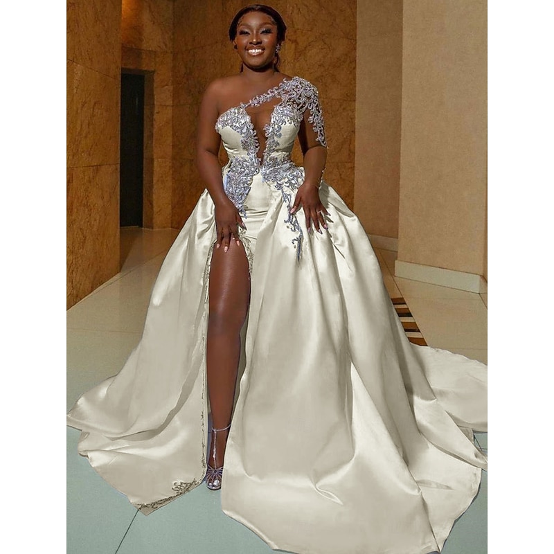 More information about Formal Wedding Dresses Ball Gown One Shoulder Regular Straps Court Train Satin Bridal Gowns With Beading Split Front