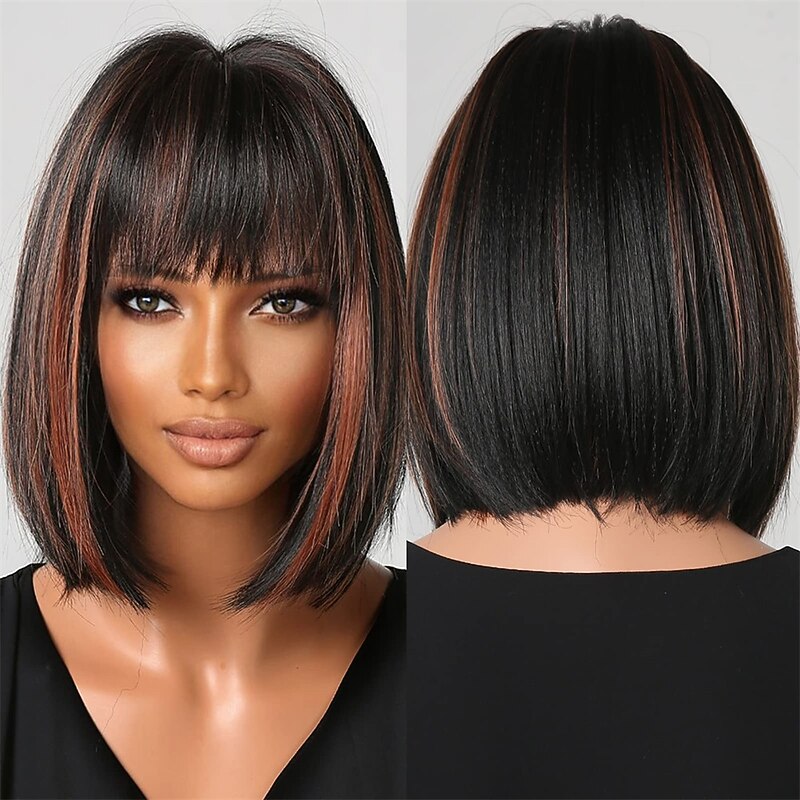 Brown Blonde Ombre Bob Wigs for Women Cosplay Wig with Bangs Dark Roots Gray Natural Hair Synthetic Wig 23