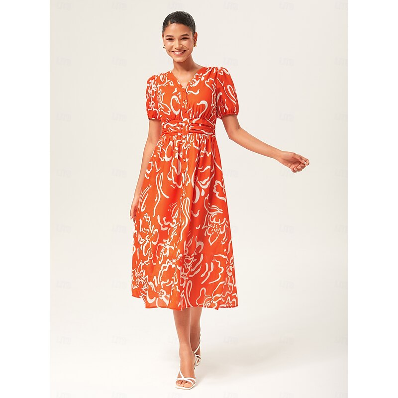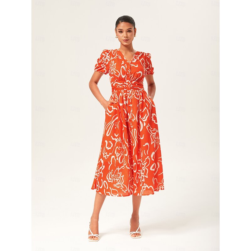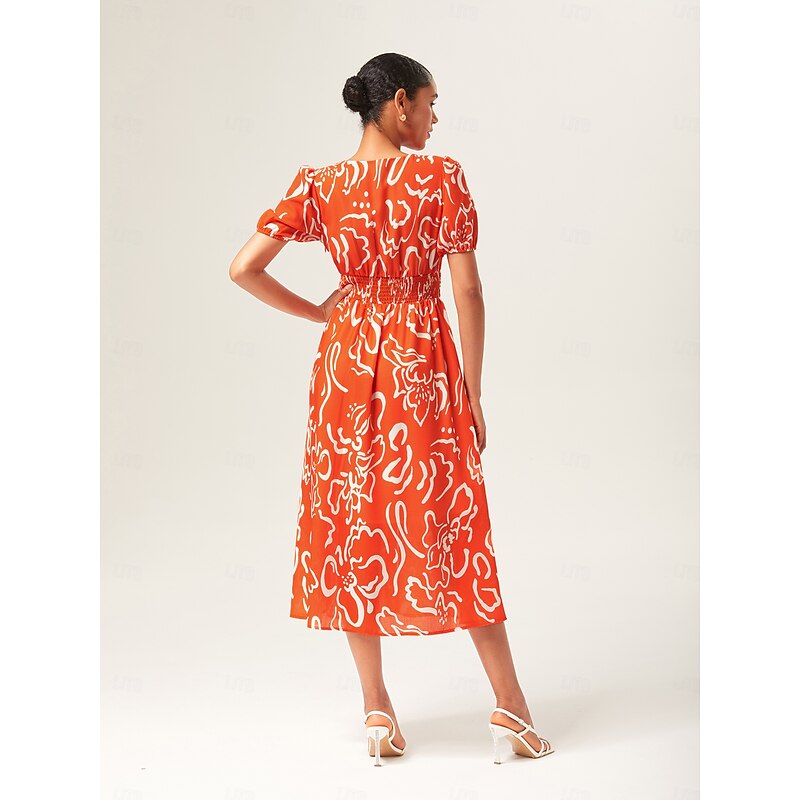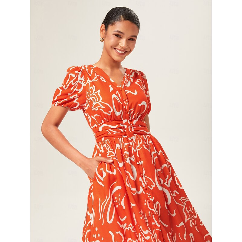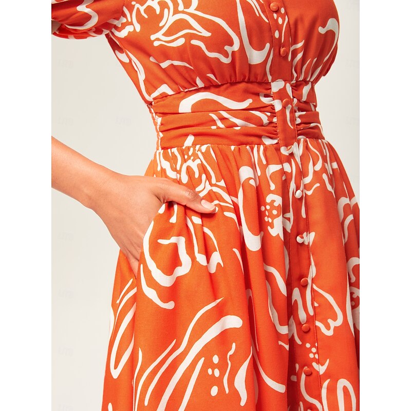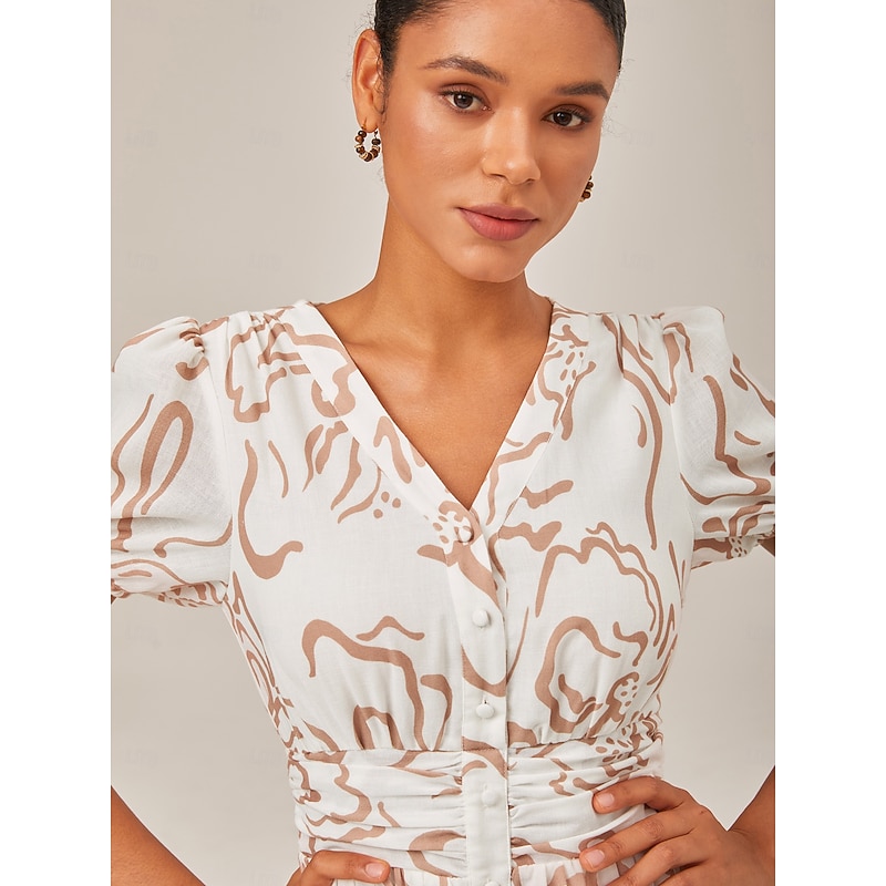 More information about Women's Abstract Art Print Linen-Like Fabric Waist-Cinching Maxi Dress