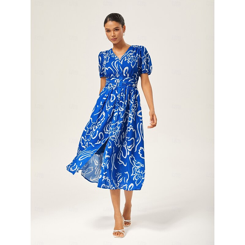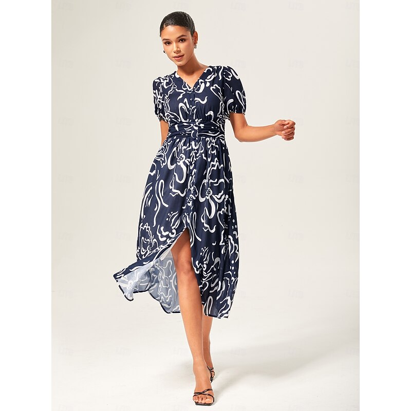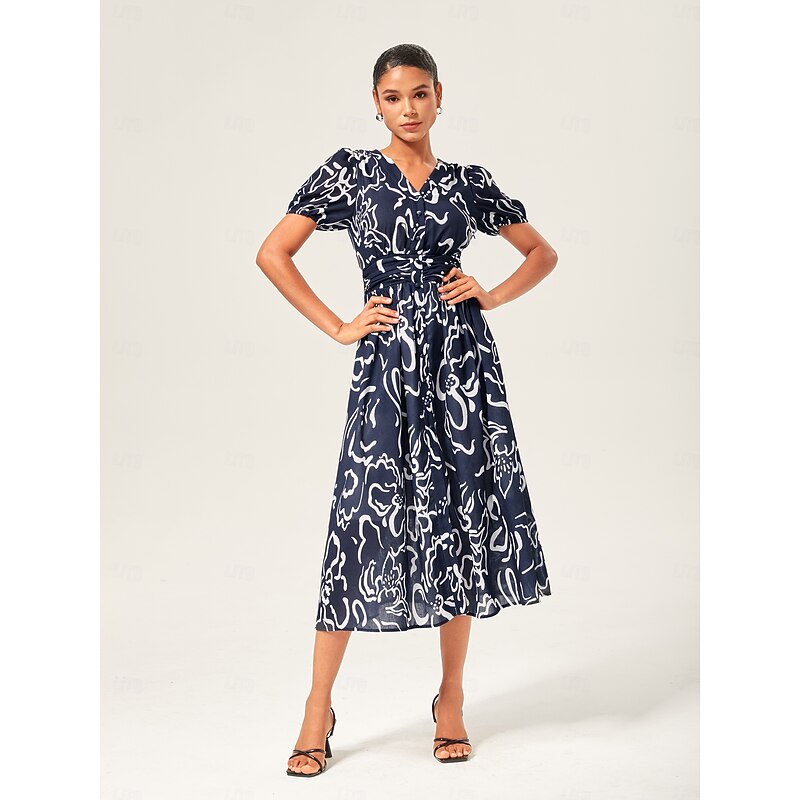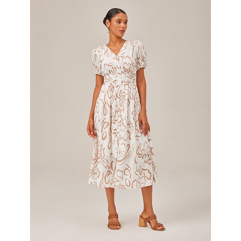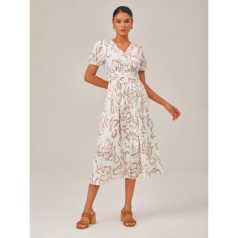 HOT ! Women's Abstract Art Print Linen-Like Fabric Waist-Cinching Maxi Dress