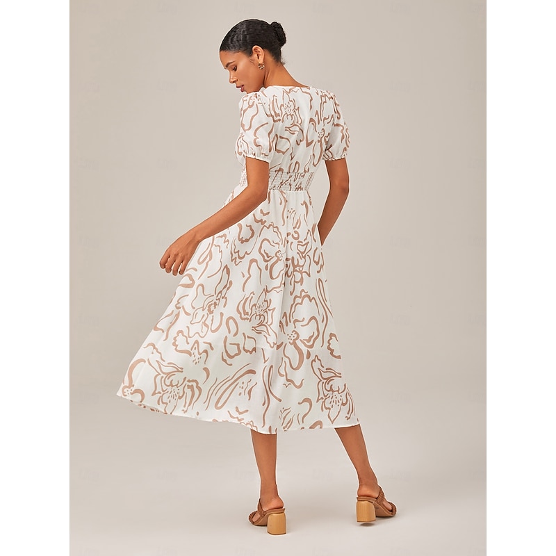 Women's Abstract Art Print Linen-Like Fabric Waist-Cinching Maxi Dress 21