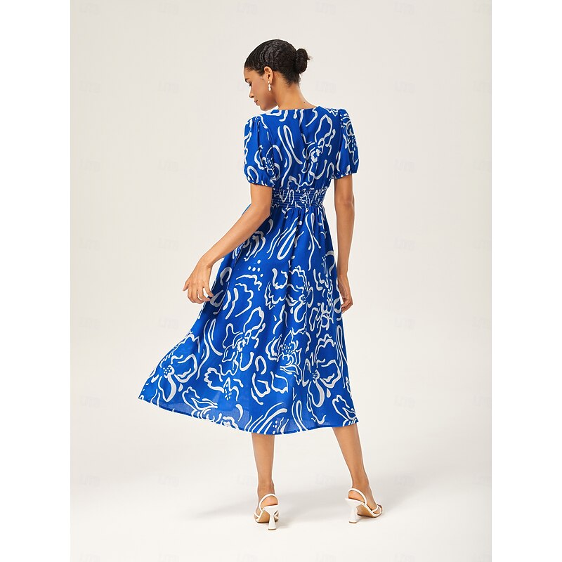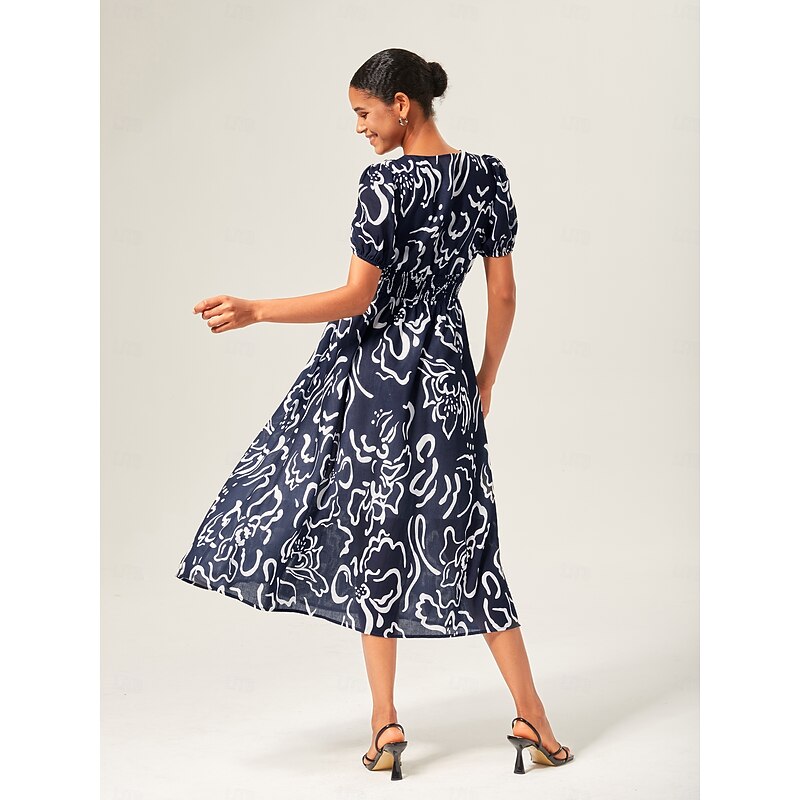 Women's Abstract Art Print Linen-Like Fabric Waist-Cinching Maxi Dress 5