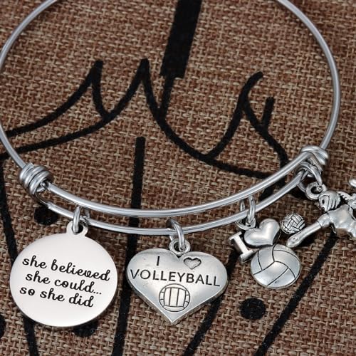 • 💗Volleyball Charm Bangle Bracelet- Volleyball Inspirational Jewelry - Volleyball Gifts for Female Volleyball Players💗-----Engraved with "She Believed She Could So She Did"Perfect Gift for Volleyball players, Volleyball Teams, Volleyball Moms and Coaches for their Birthday, Christmas, End of Season, Banquet or Just Because