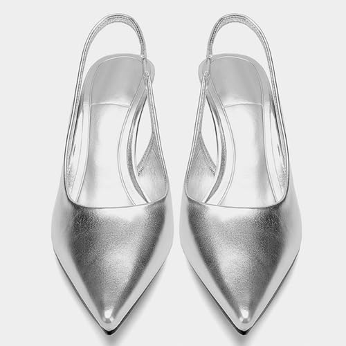 Metallic Silver Slingback Pumps Shoes for Women Kitten Heel Closed Pointed Toe Sling Back Heels Pumps 7