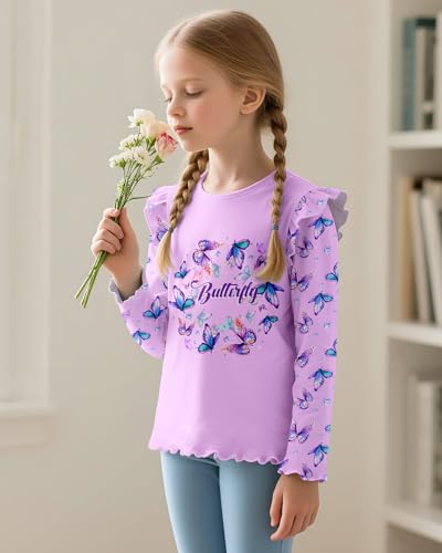 Girls Long Sleeve Ruffle T-Shirts, Basic Crewneck Everyday Tops, gentle Print Tee for Kids 3-8Y